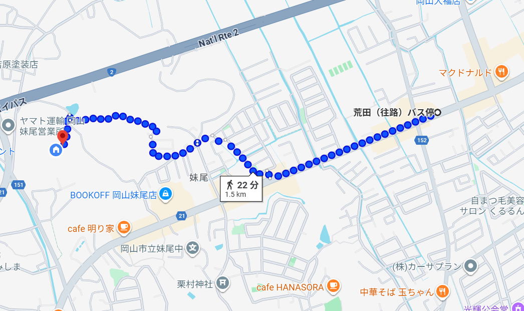 AJR宇野線各駅停車 備中箕島駅で下車、徒歩で約31分くらい。(駅から歩くルートで道がわかりやすい)