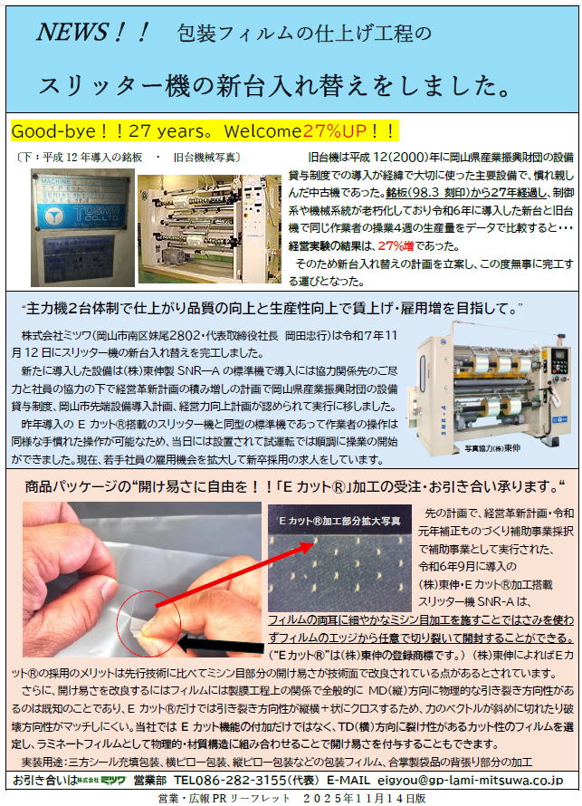 平成時代に”デザイン内製化”と”特殊グラビアカラー印刷機”と”ドライラミネート機”の導入と”工場の安全・衛生環境の改善”の取り組みによって軟包装の商品パッケージの受注を開拓しております。