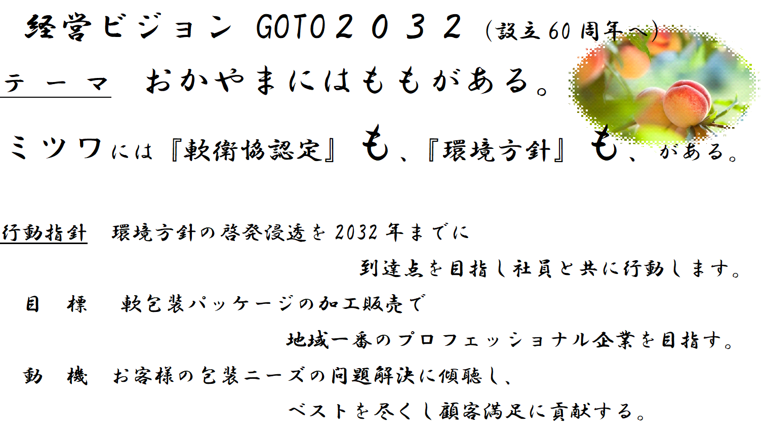 わたくしたちの暮らしの将来を包むために、常に前向きに活気ある会社から、よい商品づくりが実現できると自負しております。