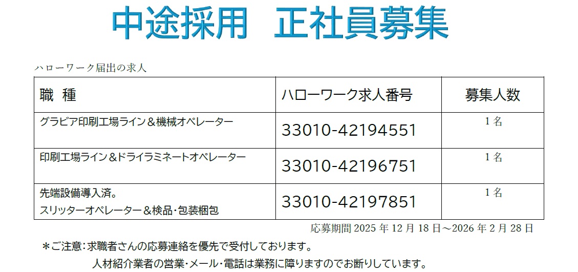 本年度の求人は5月のハローワークの指導を受けて、就業規則の大幅な見直しで改善して一新しています。そのため例年より遅く8月18日から求人のスタートです。