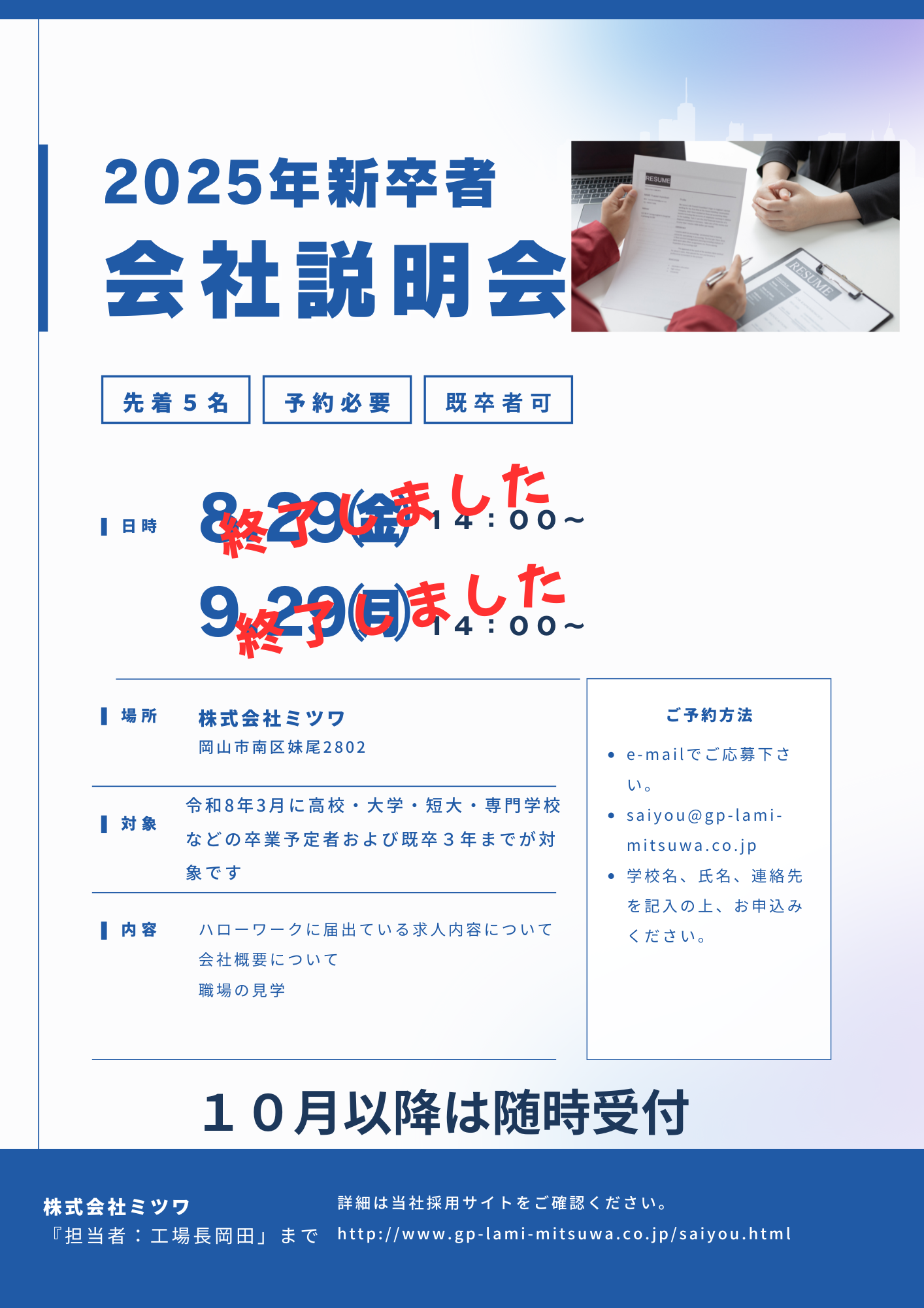 新卒求人は継続し募集しており、認知されて年々見学者は増えています。